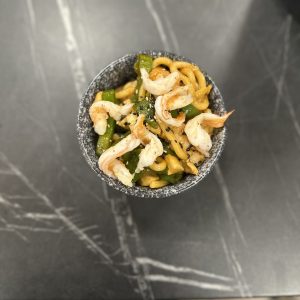 Удон, сьомга,тон,скариди,сусамово олио,гъби,чушки,соев сос,сирача,сусам,див лук/ 250 гр.