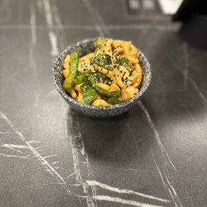 Удон, пиле, сусамово олио, гъби, чушки,соев сос,сирача, сусам,див лук/ 250гр.