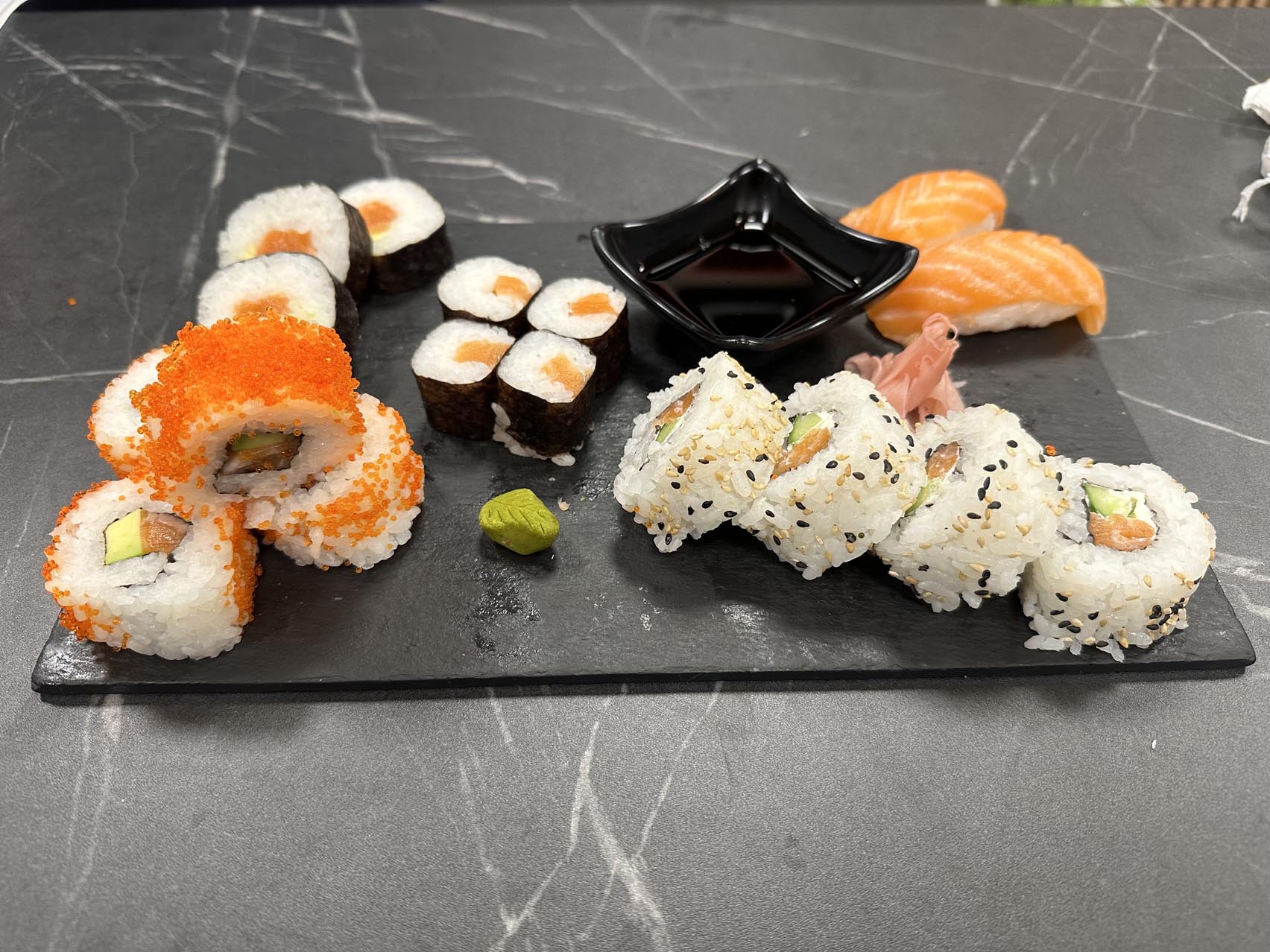 50бр/ урамаки калифорния, урамаки саке, футомаки магуро, футомаки пушена сьомга,хосомаки авокадо, хосомаки краб и крема сирене, нигири еби,нигири саке, нигири магуро/1100 гр.